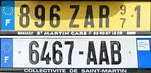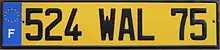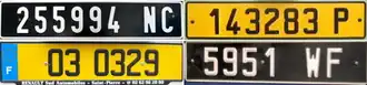 99 9999 - Wallis e Futuna: placa dianteira branca e placa traseira amarela com caracteres pretos ou placas pretas com letras prateadas. Contêm um a quatro dígitos seguidos por WF.