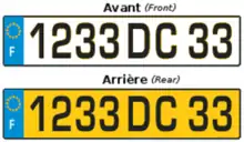 Placas de veículos emitidas após de 2009 devem estar de acordo conforme a Ordem de 9 de fevereiro de 2009 (Arrêté du 9 février 2009). Devem ser de material refletivo, brancas na dianteira e na traseira, com caracteres pretos não refletivos. Os caracteres podem estar dispostos em uma ou duas linhas. O tamanho padrão é de 520 mm × 110 mm ou de 520 mm × 120 mm se incluir a parte horizontal para informações sobre a concessionária que vendeu o veículo. O lado esquerdo das placas deve conter uma eurobanda azul com a letra F (de França) com as estrelas da Bandeira da União Europeia. Uma banda similar deve estar presente à direita das placas para indicar o código numérico do departamento e o logotipo da região na qual o departamento se localiza.[3]