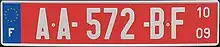 - Legifrance (9 de fevereiro de 2009). «Arrêté du 9 février 2009 fixant les caractéristiques et le mode de pose des plaques d'immatriculation des véhicules» (PDF)