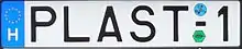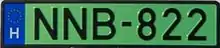 - Desde outubro de 2015, é possível solicitar placas de fundo verde para híbridos plug-in e carros elétricos que atendam a determinados critérios.[9] Os proprietários desses carros desfrutam de alguns benefícios (por exemplo: estacionamento gratuito em Budapeste e em outras cidades). [10] Normalmente, certas combinações de letras são dedicadas da série normal, que são todas placas verdes de 001 a 999. Essas combinações de letras são: NLE, NNB, PAV, PDA, PMY, PPZ, PUL, PXA, PYA, REW, RIA, RKZ, RMY, RMZ, RNY, RPZ, RVZ, RZZ e SAB a partir de 2020. Pode-se solicitar que as placas brancas da série regular sejam refeitas como placas verdes, se o carro atender aos requisitos.
