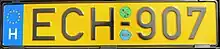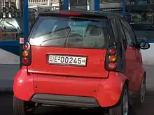 E em um Smart Fortwo (lançado em 2008) O formato é uma letra e cinco números, separados por um hífen. No lado direito, dois números pequenos indicam o ano de emissão (placas E, P, Z) ou o ano em que é válido (placas V). Por exemplo, 16 significa 2016. Nenhuma versão da UE dessas placas. A partir de 2021, as placas E, P e Z serão substituídas pela placa geral I, de acordo com uma nova Portaria, aceita em 2019. As placas V deixarão de ser emitidas.[16][17]