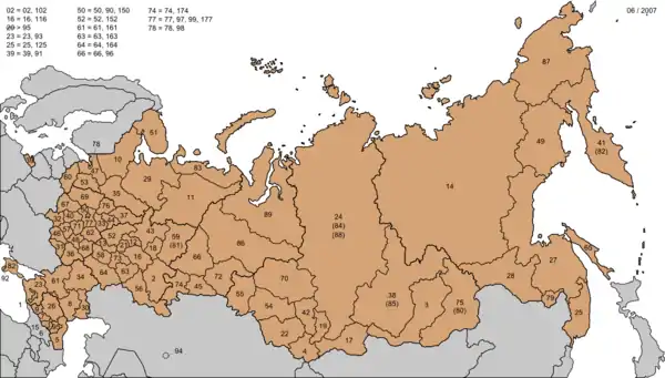 Os códigos regionais de matrícula de 01 a 89 correspondiam originalmente à ordem numérica das divisões federais da Rússia, conforme listado no artigo 65 da Constituição russa no momento da criação da norma, em 1993. Nos anos seguintes, alguns códigos foram reatribuídos ou descontinuados (por exemplo, o número de código 20 da República Chechena: para impedir registros ilegais, todos os veículos da Chechênia foram registrados novamente). À medida que as regiões populosas começaram a ficar sem combinações de placas, também foram atribuídos novos códigos após o código 89. Códigos de três dígitos adicionais foram criados adicionando "1" ou "7" ao código regional existente (por exemplo, 02 e 102 para o Bascortostão ou 16, 116 e 716 no Tartaristão).[2] O novo número mais recente a ser emitido foi o código 761 para o oblast de Rostov depois que o código 161 ficou sem todas as combinações possíveis em 19 de janeiro de 2019. As regiões com um asterisco (*) ao lado estiveram envolvidas em fusões com outras regiões e têm seus códigos listados com um asterisco com a região da qual agora fazem parte.