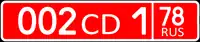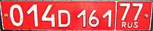Os carros diplomáticos têm caracteres brancos sobre fundo vermelho. Os três primeiros dígitos da placa são um código que identifica a embaixada à qual pertencem, atribuídos em ordem com base na data em que esse país estabeleceu relações diplomáticas com a Rússia ou sua antecessora, a União Soviética. Por exemplo, o Reino Unido é 001, os Estados Unidos são 004, o Brasil é 025, Portugal é 081 e o Sudão do Sul é 168. Os números acima de 500 identificam organizações internacionais: 505, por exemplo, indica o FMI . Nos carros dos embaixadores, esse código é seguido por CD e um dígito (004 CD 1 77 rus), enquanto os carros atribuídos a diplomatas comuns têm esse código seguido por D e três dígitos (por exemplo, 004 D 108 77 rus) . O pessoal administrativo e técnico das embaixadas, consulados ou organizações internacionais, sem status diplomático, possui formato de placa próprio (004 T 001 77 rus). | |