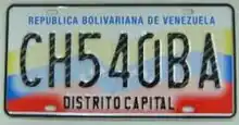 As placas de identificação de veículos na Venezuela desde 2008 seguem o formato AB 123 CD, com o nome completo do país — REPUBLICA BOLIVARIANA DE VENEZUELA — na parte superior e com o nome da divisão (Estado, Distrito Capital ou Dependência Federal) na parte inferior.