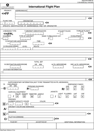 No Brasil, deverá ser preenchido utilizando-se o formulário IEPV 100-20[3] e apresentado em uma Sala AIS de Aeródromo até 45 min antes da hora estimada de calços-fora (EOBT).
