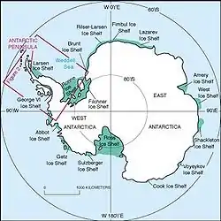 - Fox, Maggie (4 de abril de 2009). «An Antarctic ice shelf has disappeared: scientists». Reuters