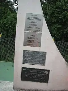 Este marco foi erigido em comemoração ao Jubileu de Prata do poço C-1 Ba., primeiro produtor comercial de petróleo em território brasileiro. Candeias, 10-12-65. Cadeias 1. Onde o sonho começou a se transformar em realidade. Homenagem aos pioneiros da Petrobras e aos 62 anos de Produção Comercial no Brasil. Candeias, 14-12-2003