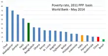 Países populosos da África Subsaariana, como Nigéria, República Democrática do Congo e Etiópia, também apresentam algumas das maiores mudanças no número de pessoas pobres.[22] Em contraste com a maior parte da tendência geral, Uzbequistão, Gana e China aumentaram a pobreza com a PPC de 2017.[23]