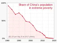 A pobreza na China é definida como qualquer pessoa nas áreas rurais que ganha menos de cerca de US $2,30 por dia (corrigido pela inflação).[1] De acordo com os critérios de 2021, todos os 98,99 milhões da população rural pobre foram retirados da pobreza, e 832 condados atingidos pela pobreza, bem como 128.000 aldeias foram removidos da lista de pobreza.[2][3] A pobreza para as zonas urbanas foi corrigida em 2010 e visa a renda, mas também as condições de vida, saúde e educação.[1] Décadas de desenvolvimento econômico reduziram a pobreza extrema urbana.[4][5] De acordo com o Banco Mundial, mais de 850 milhões de chineses foram retirados da pobreza extrema; A taxa de pobreza na China caiu de 88% em 1981 para 0,7% em 2015, medida pela porcentagem de pessoas que viviam com o equivalente a US $ 1,90 ou menos por dia em 2011, termos de paridade de preços de compra.[6][7]