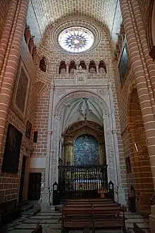 Em 1530 iniciam-se as obras de abertura da parede do transepto e, por encomenda certamente segundo T. Espanca, compra na Flandres um políptico da invocação da Senhora da Piedade. A referida Visitação chama-lhe retábulo muito bom com todos os passos da Paixão. Os polípticos sobre este assunto geralmente são compostos de seis, ou sete painéis, devendo ter sido este o número de pinturas que inicialmente decorou a capela, que é de pequenas dimensões e não comporta um retábulo muito volumoso.[1]