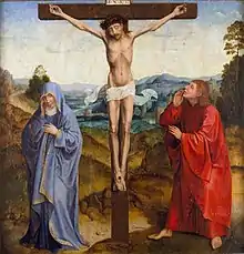 Cristo na cruz, no exacto centro da composição, é ladeado pela Virgem (no lado esquerdo) e por São João (no lado direito).[10]