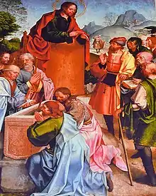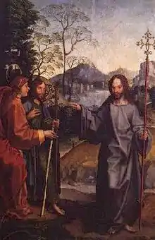 No lado direito do quadro, dominando esta metade do painel, está Jesus Cristo de frente para o observador, veste uma túnica de tons cinza, e segurando com uma mão um bordão com uma cruz no cimo ricamente lavrada de ouro e pedras preciosas, com a outra indica a São Tiago e São João que devem partir. Estes ocupam o lado esquerdo, o primeiro vestindo uma túnica de tom vermelho-alaranjado, e o segundo usando uma túnica verde com capa azul.[6]