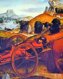 Toda este enredo é sintetizado na pintura com a ênfase dada ao cadáver de São Tiago, sendo de notar que na pintura não há alusão ao seu martírio. Envolto numa capa vermelha e com o chapéu com a vieira de peregrino, surge no centro da composição transportado numa carroça puxada por dois touros de que apenas se vê a parte posterior. A referência a episódios anteriores à chegada do corpo de Santiago à Ibéria é dada por elementos figurativos em segundo plano, nomeadamente a embarcação que está ancorada e que remete para a travessia à deriva do Mediterrâneo, desde a Palestina até chegar à Galiza, também pelo palácio da Rainha, situado num promontório rochoso, e ainda pelos dois touros que estão no caminho que conduz ao paço real evocando a narrativa da lenda.[10]
