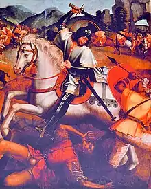 A partir do ano de 830 circulou o rumor de que o túmulo de Santiago havia sido encontrado na Galiza e, com o intuito de infundir coragem nos combatentes das Cruzadas, mais tarde foi difundida a lenda de que, em 844, na Batalha de Clavijo, Santiago montado num cavalo branco tinha ajudado a derrotar os mouros sendo este o episódio da vida de Santiago que surge representado neste quadro.[12]