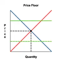 O preço-piso deve ser fixado acima do preço de equilíbrio de livre mercado. No gráfico à direita, a linha tracejada verde representa um preço mínimo fixado abaixo do preço de livre mercado. Neste caso, o piso não tem efeito prático. O governo ou a empresa ordenou um preço mínimo, mas o mercado já tem um preço mais elevado.