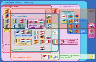 | A Diretiva 2004/38/EC define o direito de livre circulação dos cidadãos do Espaço Económico Europeu (EEE), que inclui a União Europeia (UE) e três membros da Associação Europeia de Comércio Livre (AECL, EFTA), nomeadamente, a Islândia, a Noruega e o Liechtenstein.[7][8][9] A Suíça, que é membro da AECL (EFTA), mas não do EEE, não está vinculada à Diretiva, mas tem um acordo multilateral separado sobre a livre circulação com a UE e os seus estados-membros. A livre circulação entre a Suíça e os outros países da AECL (EFTA) acontece de acordo com a convenção da AECL (EFTA). Todos estes países fazem parte do Mercado Interno da UE.[10]
