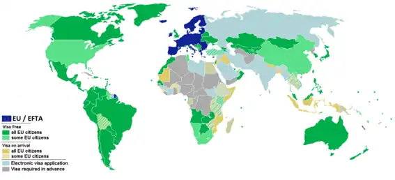 Os cidadãos nacionais dos estados-membros do Mercado Interno da UE não estão apenas isentos de visto, mas também têm o direito legal de entrar e residir nos países uns dos outros. Contudo, o direito à livre circulação nos países uns dos outros pode ser limitado num número reservado de situações, conforme prescrito pelos tratados da UE.[5][6]