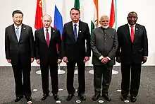 Bolsonaro representou o Brasil na 14.ª reunião de cúpula do G20 em Osaka, no Japão, realizada entre 28 e 29 de junho de 2019. Ao chegar do encontro, o presidente avaliou que teve sua "missão cumprida" e lembrou o anúncio do acordo comercial entre União Europeia e Mercosul, negociado ao longo de 20 anos. Entre as principais reuniões de Bolsonaro, estiveram os encontros com o presidente da França, Emmanuel Macron, e a com a chanceler alemã, Angela Merkel, para quem disse que o Brasil é alvo de uma "psicose ambientalista". A questão ambiental também foi alvo do encontro com Macron, onde Bolsonaro sinalizou que o Brasil vai continuar no Acordo do Clima de Paris, que estabelece metas de redução da emissão de gases estufa. A garantia dada por Bolsonaro foi considerada por Macron um dos pontos-chave para a celebração do acordo UE-Mercosul.[93] "Eu convidei [Macron] para conhecer a região amazônica. Falei para ele [de fazermos] uma viagem de Boa Vista a Manaus. É pouco mais de duas horas. A gente poderia até voar a uma altura mais baixa, demoraria mais tempo, em um avião da Força Aérea, para ele ver que não existe o desmatamento tão propalado", afirmou Bolsonaro. O presidente brasileiro também teve uma reunião com líderes dos BRICS e com Donald Trump, presidente dos Estados Unidos, com quem discutiu a possibilidade da aplicação de mais sanções econômicas contra Venezuela e Cuba.[94] Havia a programação de uma reunião bilateral com o presidente da China, Xi Jinping, mas que acabou cancelada.[95]