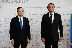 No dia 28 de junho, a equipe do governo responsável pela negociação de acordos internacionais, na véspera da 14.ª reunião de cúpula do G20, colaborou com a efetivação do tratado entre o Mercosul e a União Europeia, em Bruxelas.[59][60] O acordo passava por tentativas inconclusivas de negociação desde 1999 e a equipe escolhida para representar os interesses do governo e que efetivou as negociações foi formada por Paulo Guedes, Tereza Cristina, o chanceler Ernesto Araújo (respectivamente chefiando os ministérios da Economia, Fazenda e Relações Exteriores), assim como o secretário especial de Comércio Exterior do Ministério da Economia, Marcos Troyjo.[61] Durante os 20 anos de tentativas, o progresso do acordo permaneceu relativamente estagnado até 2010, quando as negociações foram relançadas.[62][63]