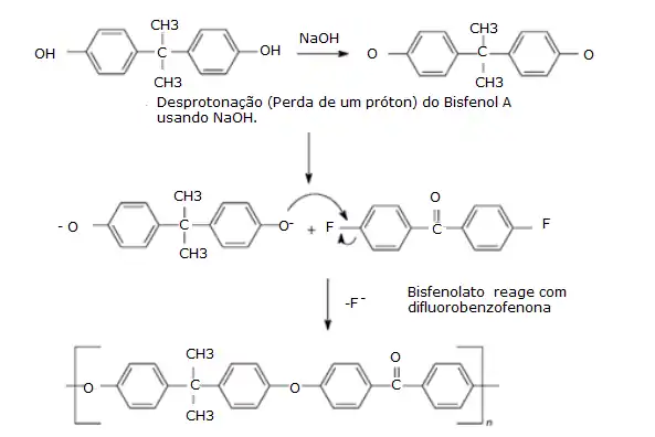 Reação química para obtenção do PEEK através da substituição nucleofílica aromática[8]: