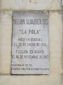 Mais de setenta anos após a morte de La Pola, pela lei 15 de 2 de outubro de 1894 assinada pelo presidente Miguel Antonio Caro, 10 mil pesos foram atribuídos para a elaboração de um monumento em honra a Policarpa Salavarrieta na cidade de Guaduas. Nessa ocasião Miguel Antonio Caro declarou que: "a memória dessa mártir da liberdade deve ser perpétua às gerações futura como exemplo de verdadeiro patriotismo e de sacrifício desinteressado e frutuoso para a causa da República".[2]
