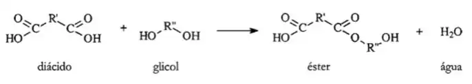 - Polímeros formados através de uma reação de condensação, a partir de dois diferentes tipos de monômeros, bi ou trifuncionais, com eliminação de uma molécula pequena, geralmente a água ou HCl.[4]
