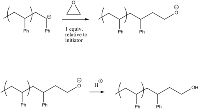 Uma abordagem alternativa para funcionalizar grupos terminais é começar a polimerização com um iniciador aniônico funcional. [1] Neste caso, os grupos funcionais estão protegidos uma vez que as extremidades da cadeia polimérica aniônica são uma base forte. Este método leva a polímeros com pesos moleculares controlados e distribuições estreitas de pesos moleculares. [5]
