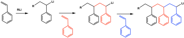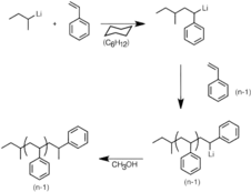 O uso de metais alcalinos para iniciar a polimerização de 1,3- dienos levou à descoberta por Stavely e colegas de trabalho da empresa Firestone Tire and Rubber do cis-1,4- poliisopreno. Isso desencadeou o desenvolvimento de processos comerciais de polimerização aniônica que utilizam iniciadores de alquil-lítio.