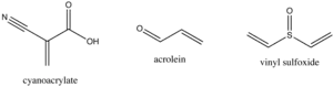 Os monômeros ativados por grupos eletronegativos fortes podem ser iniciados mesmo por nucleófilos aniônicos fracos ou neutros (como aminas e fosfinas). O exemplo mais proeminente é a cura do cianoacrilato, que constitui a base da supercola, onde apenas vestígios de impurezas básicas são suficientes para induzir uma polimerização por adição aniônica ou uma polimerização por adição zwitterioniônica. [3]