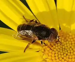 Uma mosca sirfídea (Eristalinus taeniops) polinizando uma flor de Hieracium sp.