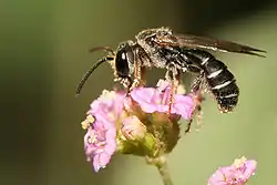 Abelha do gênero Lipotriches sp. polinizando flores.
