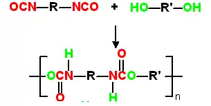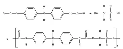 A principal reação de produção de poliuretanos tem como reagentes um diisocianato, disponível nas formas alifáticas ou aromáticas, e um diol (como o etileno glicol, 1,4 butanodiol, dietileno glicol, glicerol)[1] ou um poliol poliéster, na presença de catalisador e de materiais para o controle da estrutura das células (surfactantes), no caso de espumas e tintas. Quando, na reação de polimerização, o diol é substituído por uma diamina, obtém-se uma poliureia, porque a unidade básica torna-se uma ureia e não um carbamato[1].