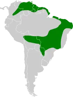 Pode ser encontrada nos seguintes países: Argentina, Bolivia, Brasil, Colombia, Guiana Francesa, Guiana, Paraguai, Peru, Suriname, Trinidade e Tobago e Venezuela.[2]