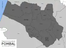 É sede do município de Pombal que tem 626,00 km² de área[2] e 51 170 habitantes (2021),[3][4] está subdividido em 13 freguesias.[5] O município é limitado a Norte pelos municípios da Figueira da Foz e de Soure, a Este por Ansião e Alvaiázere, a Sudeste por Ourém, a Sudoeste por Leiria e a Oeste possui uma faixa de litoral no Oceano Atlântico (Praia do Osso da Baleia). Muita da riqueza encontra-se ainda viva em Pombal em pavimentos, estátuas e até mesmo nos canais.