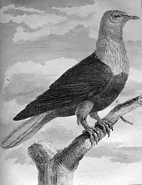 - Tradução livre de: "The second is the pigeon with a mane; the inhabitants of the Ile de France [Mauritius] call it pigeon hollandais; the head, neck and chest are adorned with long pointed white feathers which it can raise at will; the rest of the body, and the wings, are a fine deep violet; the end of the tail is a purplish red. It is one of the finest species of its kind ... The second of these birds lives solitary in river valleys, where I have often seen it without being able to secure one. It eats fruit and fresh water molluscs."