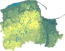 O ponto mais alto é o topo do monte Wieżyca — 329 m acima do nível do mar. Jastrzębia Góra é onde fica o ponto mais setentrional da Polônia, a Estrela do Norte (🌍).[6][7]