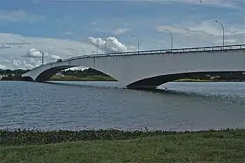 Oscar Niemeyer desenhou a ponte, que ele chamava de Ponte Monumental, e acabou sendo a única projetada por ele que foi construída. |
