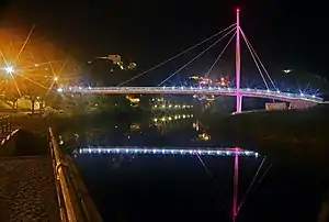 A ponte está situada na zona do Cais, em Odemira.[2] Foi construida para facilitar as ligações entre as áreas do Bairro das Barreiras Vermelhas e o Loteamento Roça Matos, na margem esquerda do Rio Mira, e o centro histórico e comercial da vila, na margem direita.[1] Ao mesmo tempo, também contribuiu para a renovação da imagem da vila, devido às suas formas dinâmicas e arrojadas.[3] No âmbito da instalação da ponte, a área na margem esquerda também foi alvo de um processo de requalificação, com a instalação de zonas ajardinadas e de equipamentos lúdicos e culturais.[1] Na estrutura destaca-se a sua iluminação, instalada pela empresa Aura Light, tendo sido aplicada uma solução discreta, coroada por uma luz branca no topo, iluminando igualmente a parte baixa do tabuleiro, de forma a salientar a estrutura sobre o rio, e melhor revelar as suas linhas inovadoras.[4] As cores das luzes podem ser mudadas com recurso a um controlador RGB, de forma a adequarem-se a várias situações, por exemplo eventos festivos.[4] A iluminação da ponte também é um exemplo de como o design foi combinado com a eficiência do ponto de vista energético, uma vez que os equipamentos têm um consumo máximo de apenas 650 W.[4]