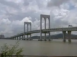 É uma ponte de dois andares, sendo seis vias de circulação no tabuleiro e duas no tabuleiro inferior, as últimas são reservadas para serem utilizadas durante intempéries, além do espaço para duas linhas do Metro Ligeiro de Macau.[4] Os pilares centrais da ponte possuem o formato que lembra a letra M.[1]