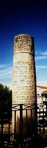 - Aquiflavienses, Arobrigenses, Bíbalos, Celernos, Equesos, Interâmicos, Límicos, Ebisocos, Quaquernos e Tamaganos [erigiram este monumento] ao Imperador César Vespasiano Augusto, Pontífice máximo, com o poder tribunício pela décima vez, aclamado imperador pela vigésima vez, pai da Pátria e Cônsul pela nona vez, ao Imperador (Tito) Vespasiano César, filho de Augusto, Pontífice, com o poder tribunício pela oitava vez, aclamado imperador pela décima vez [e ao César Domiciano, filho de Augusto, Cônsul pela sexta vez], a Caio Calpetano Râncio Quirinal Valério Festo, legado propretor do Augusto, a Décimo Cornélio Meciano, legado de Augusto, a Lúcio Arrúncio Máximo, procurador de Augusto e à Legio VII Gemina Felix.