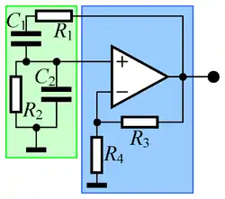 Considere e as tensões de entrada e saída do amplificador e a corrente de saída do mesmo. Obtêm-se as seguintes equações para os nós do circuito: