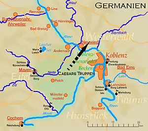 - Especulações sobre a localização das pontes derivam principalmente da natureza temporária da construção e da falta de uma localização precisa no relato de César. Porém, escavações na região de Andernach-Neuwied encontraram resíduos de pilares, atribuídos às pontes de César. Alternativamente, um local ao sul de Bonn também foi proposto.[1]
