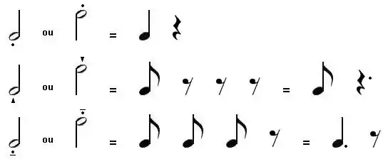 - Triplo, quando há três pontos consecutivos, o que soma ao valor original a metade, um quarto e um oitavo de sua duração.[1]