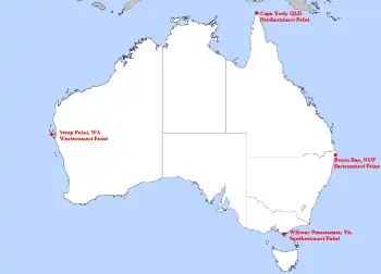 - Excluindo ilhas e o Território Antártico Australiano: Cabo Byron, Nova Gales do Sul (153°38' E)[2]