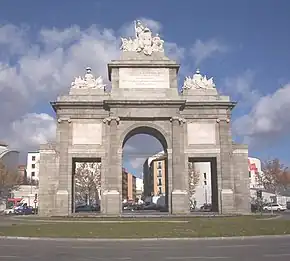 Por cima do arco principal, existe uma inscrição com a seguinte frase: '«'A Fernando VII el Deseado, padre de la patria, restituido a sus pueblos, exterminada la usurpación francesa, el Ayuntamiento de Madrid consagró este monumento de fidelidad, de triunfo, de alegría. Año de MDCCCXXVII».