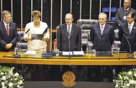 Dilma Rousseff tomou posse a 1 de janeiro de 2011 como 36.ª presidente da República Federativa do Brasil, e como a primeira mulher a assumir o cargo no país. Em cerimônia iniciada às 14 horas (horário local), no plenário do Congresso Nacional, em Brasília. Ela foi empossada juntamente com o vice-presidente, Michel Temer. A cerimônia foi conduzida pelo então presidente do Senado Federal, José Sarney. A presidente eleita leu o compromisso oficial de "manter, defender e cumprir a Constituição, observar as leis, promover o bem geral do povo brasileiro, sustentar a união, a integridade e a independência do Brasil". O vice-presidente leu o mesmo termo de posse e, em seguida, foi ouvido o hino nacional na execução da banda dos fuzileiros navais.[1]