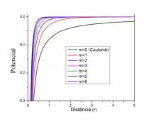 de modo que podemos identificar a equação acima, com a ε, como o potencial de Coulomb. Diferentemente do potencial de Yukawa, podemos ver claramente que decresce muito lentamente, enquanto que o potencial de Yukawa decresce muito rapidamente (a depender da massa m). Por essa razão, dizemos que o potencial de Yukawa é um potencial de curto alcance, enquanto que o potencial de Coulomb não é. No gráfico que é apresentado ao lado, podemos ver como o potencial de Yukawa comporta-se, com a distância , para diferentes valores de .