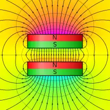é chamada de densidade de carga magnética ligada. Cargas magnéticas nunca ocorrem isoladas como monopolos magnéticos, mas apenas dentro de dipolos e em ímãs com uma soma total de carga magnética de zero. A energia de uma carga magnética localizada qm em um potencial escalar magnético é