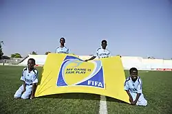 Crianças da Somália exibindo a bandeira My game is fair play (meu jogo é o jogo limpo, em tradução literal), em 2014.