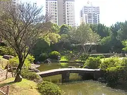 A praça foi projetada pelo arquiteto e paisagista japonês Kunie Ito[2], seguindo o tradicional estilo dos jardins japoneses. Possui um lago, uma cascata, uma ponte de pedra, um quiosque, uma fonte e esculturas. Toda a praça é murada por uma cerca de arame, atrás da qual há arbustos e árvores cobrindo seu interior. Na parte mais alta, há um monumento a Buda.